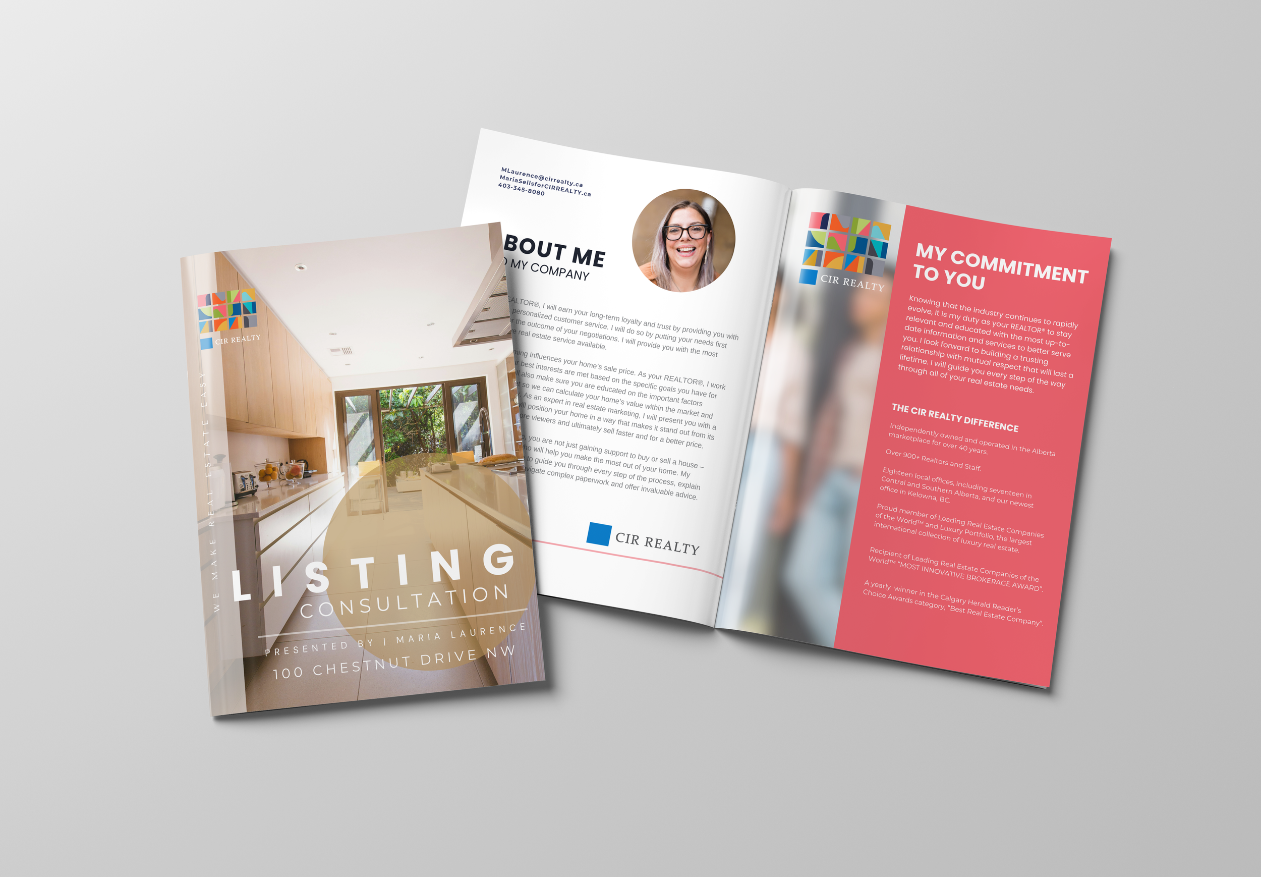 This custom-designed listing presentation for CIR Realty realtors is a polished, high-impact print piece designed to elevate client interactions. The layout seamlessly blends CIR Realty’s branding with modern aesthetics, ensuring a professional and engaging experience for potential sellers.